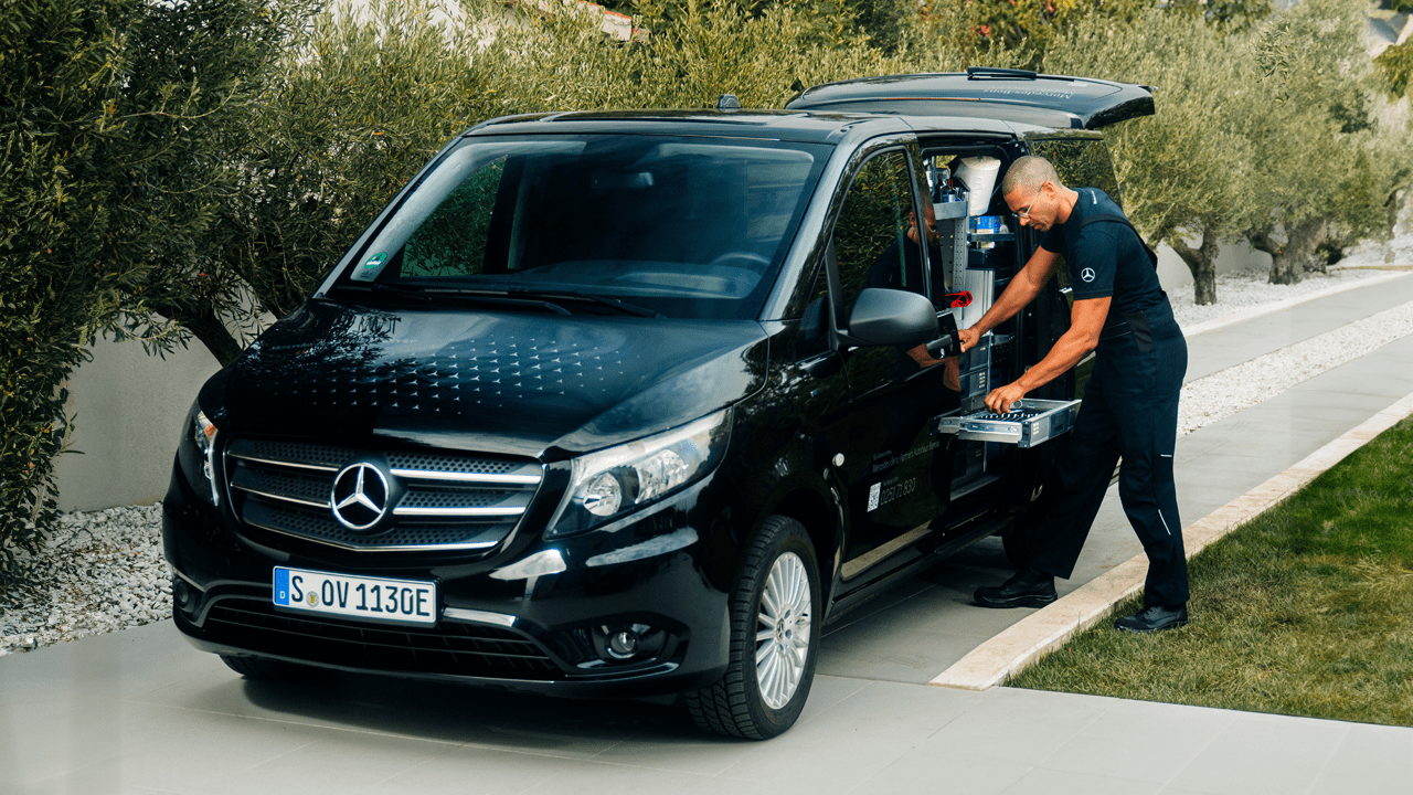 Le service mobile de Mercedes-Benz utilise des véhicules entièrement aménagés et équipés comme de véritables ateliers mobiles, prêts à intervenir directement sur le terrain. Ces véhicules de service disposent de systèmes d'étagères et de tiroirs permettant d'embarquer de nombreux outils et appareils spécifiques, ainsi qu'un stock de pièces détachées d'origine Mercedes-Benz. Un système de levage mobile permet même de travailler en toute sécurité sous le véhicule du client.